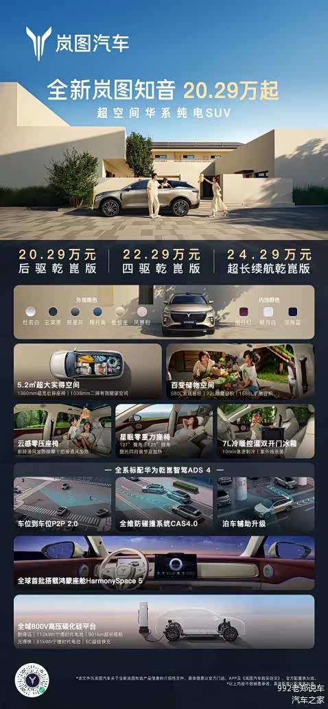 - 在智能上,全新岚图知音是20万真满血华为纯电SUV,全球首批搭载乾崑智驾ADS 4与鸿蒙座舱HarmonySpace 5,且其智驾版本为当前法规框架下体现华为最高智驾辅助驾驶能力的ADS Max超阶版!在空间上,它拥有行业最大的90.8%“得房率”与1038mm二排腿部空间,堪称“空间魔术师”;在舒适上,它将50万级的云感零压座椅等豪华配置下放,全方位提升驾乘质感;在三电上,它更为长途出行提供了全域800V高压平台,无论是5C超充还是901公里的超长续航,都将为用户解决出行焦虑。