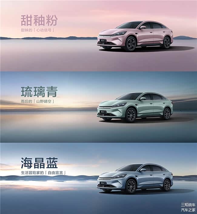 同时,为满足更多用户不同的个性化审美需求,秦L EV全系新增三款富有生命力的全新配色。甜釉粉,是专属于情侣的“心动讯号”,粉中带蓝,温暖甜蜜,车身自带“柔光滤镜”,让人一眼心动;琉璃青是献给年轻人的“气质杀”,以古法琉璃的通透为底,如雨后初晴的天空,通透又富有层次;海晶蓝是送给生活冒险家的“自由宣言”,车色如海浪随角度不断变幻,展现出玻璃棱镜效果,随手一拍就是大片。