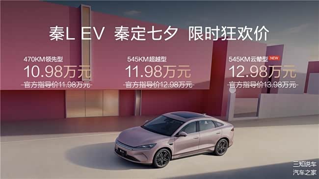 8月29日,秦LEV正式上新云辇型,搭载了云辇-C智能阻尼车身控制系统和TBC高速爆胎稳行系统两大超级“神装”,七夕宠粉价12.98万元,树立起同级产品力天花板。同时,秦LEV全系价值重塑,推出“秦定七夕限时狂欢价”,即日起至9月30日,全系车型限时售价10.98——12.98万元,为用户提供了中级纯电轿车最优选择。