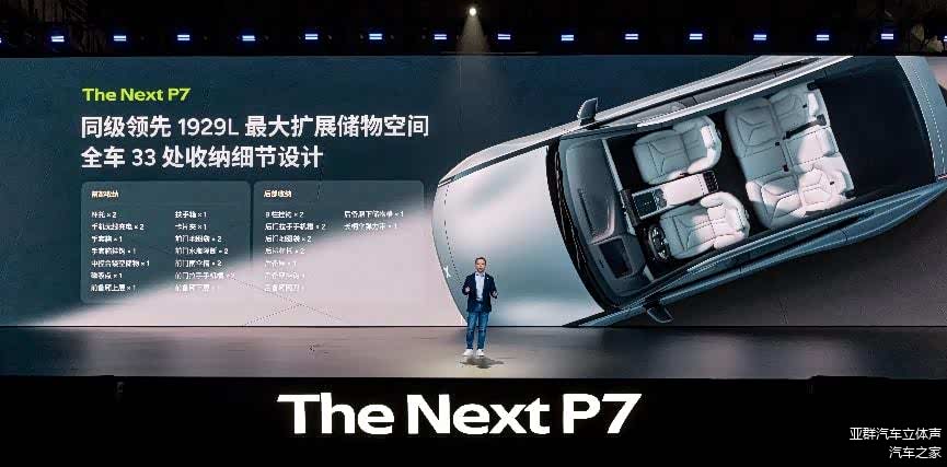 储物能力方面,全新小鹏 P7 借助中置驱动系统的布局优势,额外增加了前备箱配置,整车常规储物空间达 631L;若将后排座椅放倒,储物空间可进一步扩容至 1929L,足以容纳行李箱、婴儿车等大件物品。此外,车内还精心设计了 33 处收纳场景,小到手机、钱包、充电宝,大到包包、面膜、化妆盒,都能找到专属放置位置,极大提升了日常使用便利性。