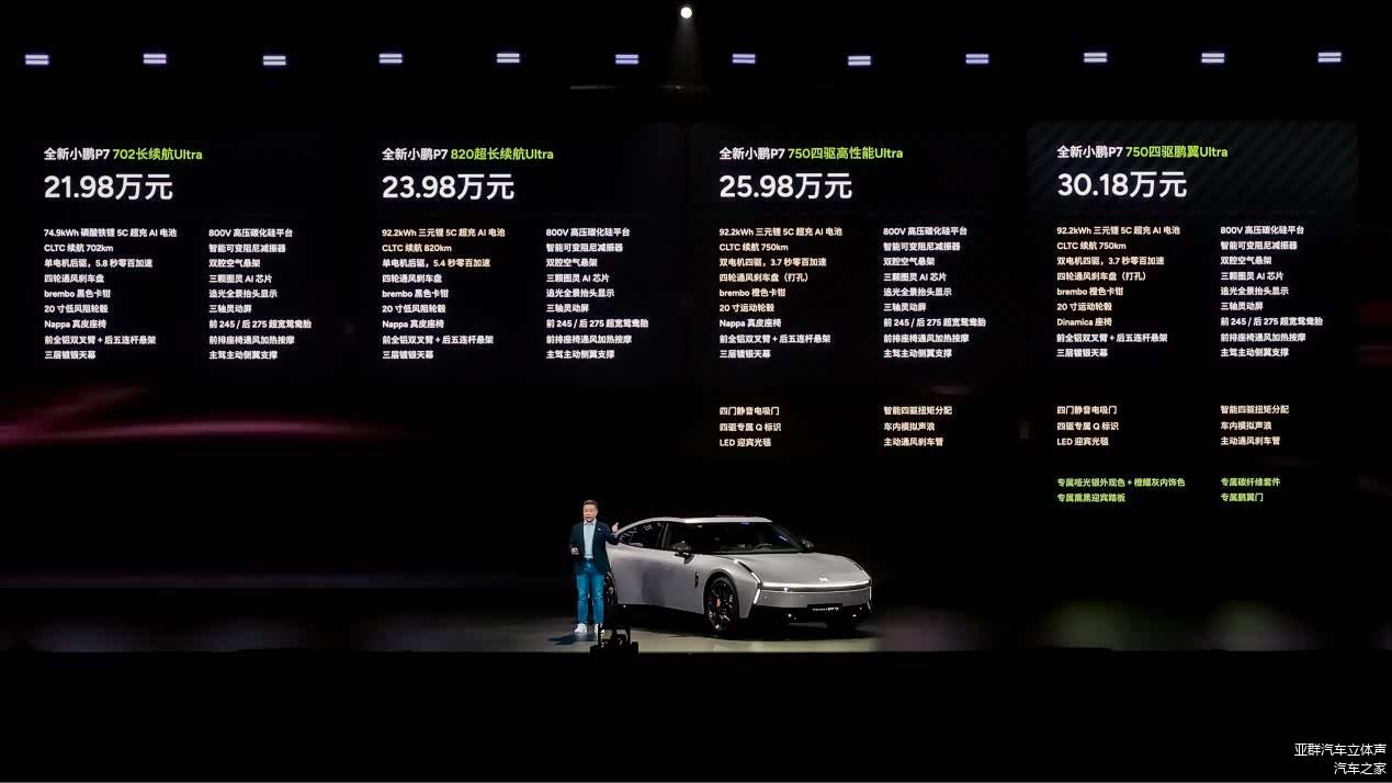 8 月 27 日,备受万众期待的全新小鹏 P7 正式迎来上市时刻,同时揭晓了消费者关注已久的价格悬念。此次新车共推出 4 款配置版本,分别为 702 长续航 Ultra、820 超长续航 Ultra、750 四驱高性能 Ultra 以及 750 四驱鹏翼 Ultra,官方指导价区间为 21.98 万 - 30.18 万元。