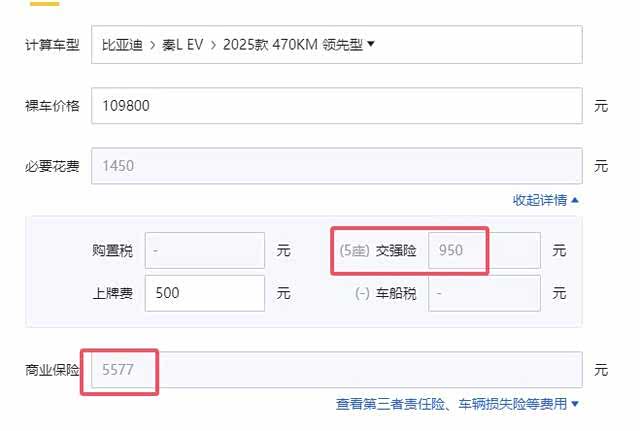 第一个:保险费并不便宜,裸车价109800元的最低配,交强险要950元,而商业保险,在全险的情况下,报价却来到了5577元,换言之,一年的保险费高低也要给到6500多,而我在市场上随便找了一辆油车,也是10万的报价,结果,保险费是950元加商业全险却只要4079元,啥概念?相当于秦L保险费比油车贵了1000多。