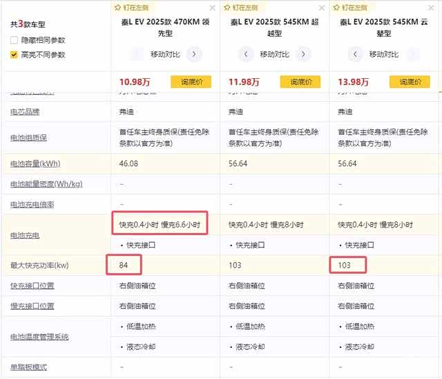第五个:没有兆瓦闪充,原本,我还以为这一次的比亚迪会把兆瓦闪充技术下放到平民车上,可后来发现这一次的改款,也就是增加了一些基础配置以外,其他的内容纹丝不动,快充方面,低配只有84kw,而中配开始是103kw,现在动辄都是800V的情况下,这个快充速度显然是有点不太够看的。
