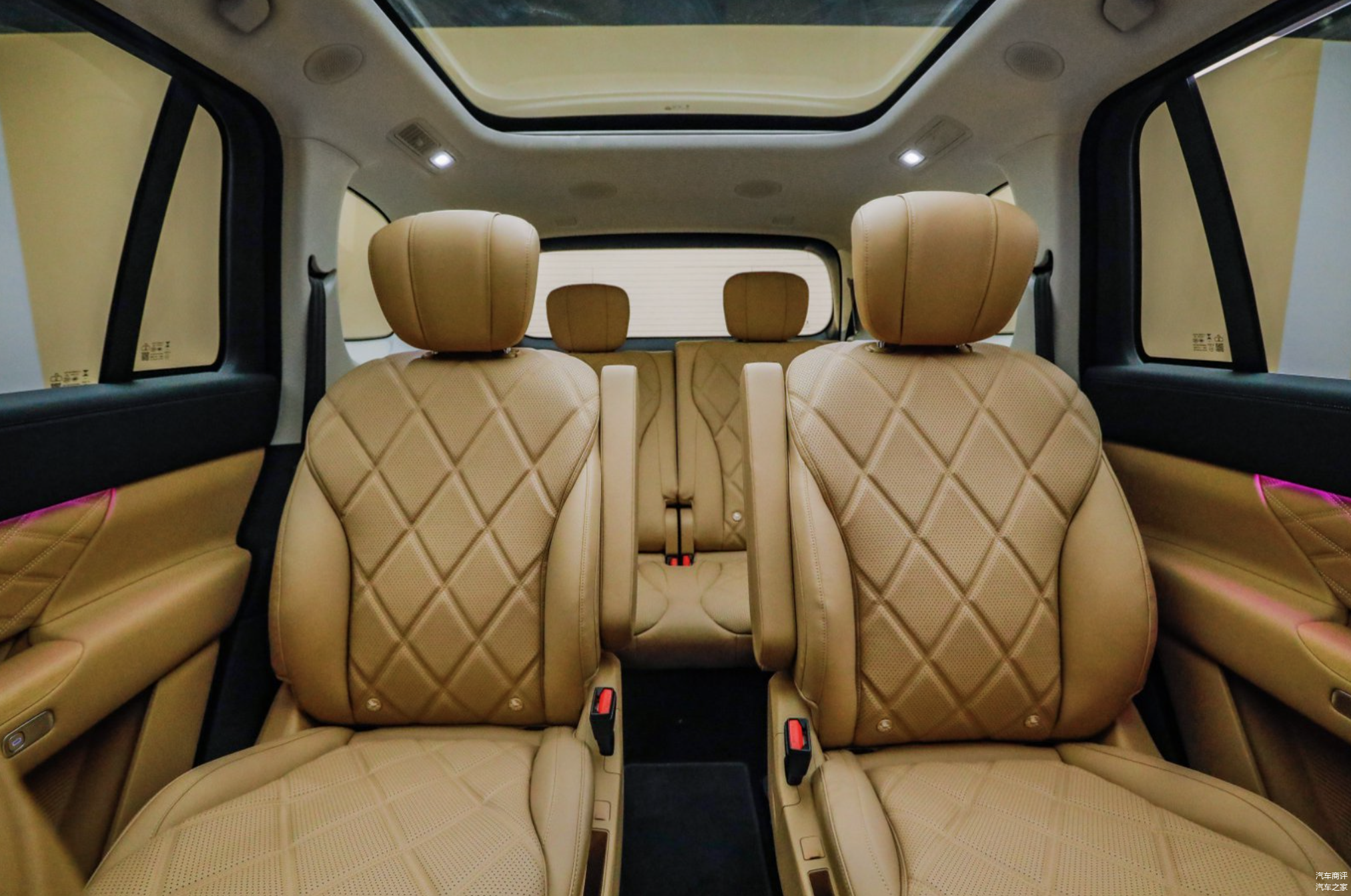 相较于外观上的豪华大气,内饰则更多体现的是一种科技豪华,车内加入了大面积的软性面料包覆,配合木纹材质、双绗缝工艺、隐藏式256色漫反射氛围灯、以及对标柏林之声的伯牙之音,可以说从多个方面,开启了顶格对标迈巴赫。