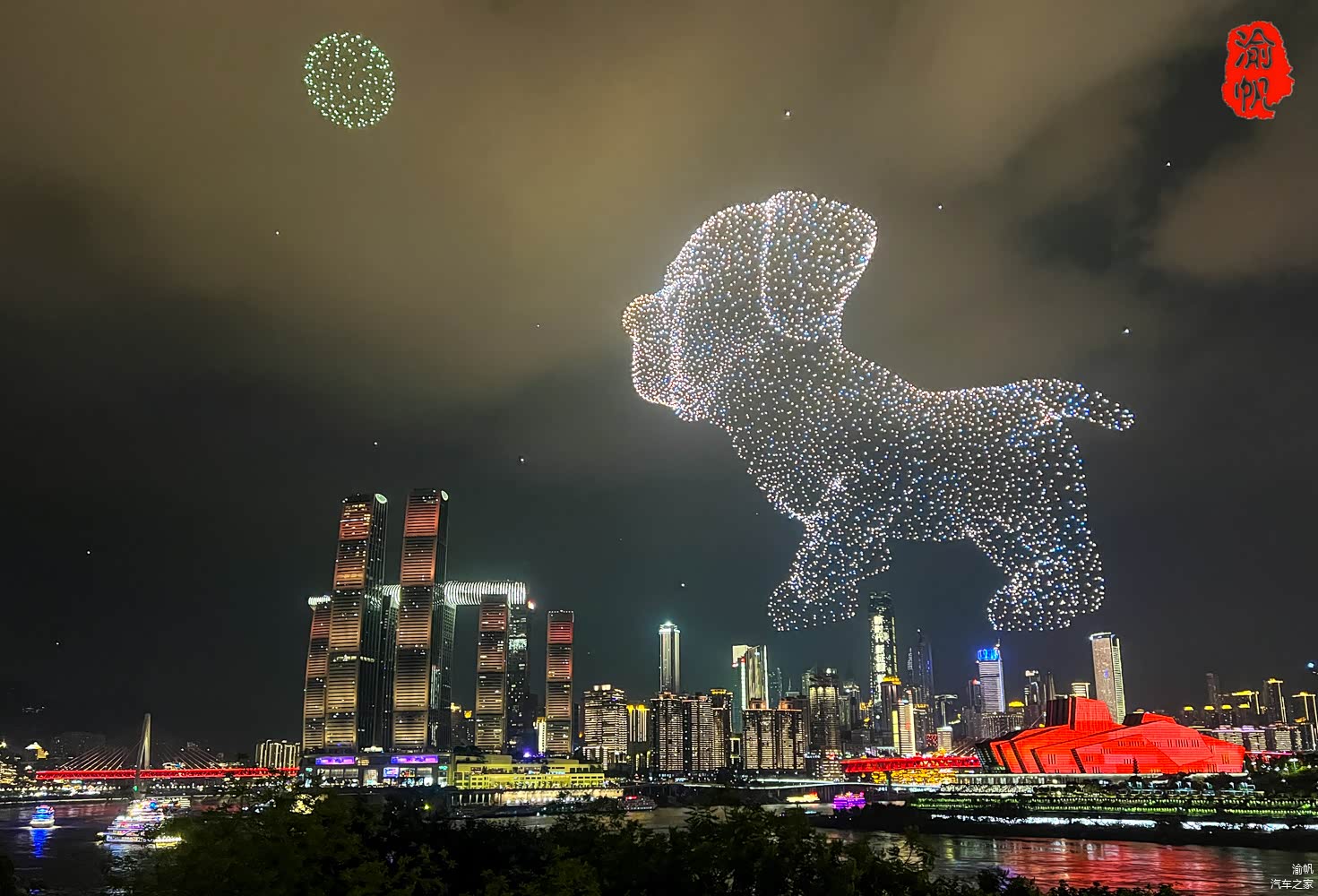紧接着是“萌犬跃山城”,无人机光点化作一只憨态可掬的小狗形象。它眨着星星般的眼睛,在错落楼宇间追逐光球,将山城的立体魔幻与童趣温暖完美融合。让人们看到了重庆在繁华都市形象之外,充满温情与关爱的一面,原来这座火辣的城市也有着如此柔软可爱的一面。