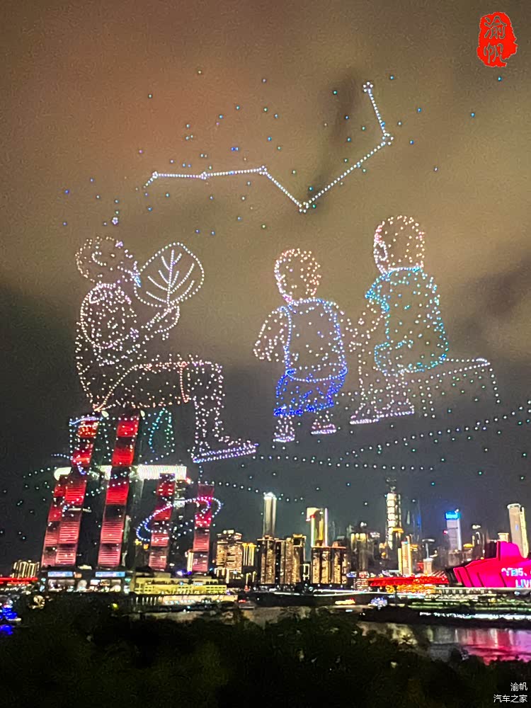 无人机秀每周六晚上21:00准时举行,第一个画面是“新韵重庆,长安同行”的主题,也算是活动方的一个广告,第二幅是仲夏之夜,五千架光点化作流萤,在山城轮廓间编织出夏夜老院乘凉的场景:竹椅摇曳,蒲扇轻摇的虚影里,北斗七星如碎钻悬于天际,江风拂过光幕,仿佛能听见蝉鸣与邻家闲话,传统夏夜在科技光影中重生,璀璨如星河倾落人间。
