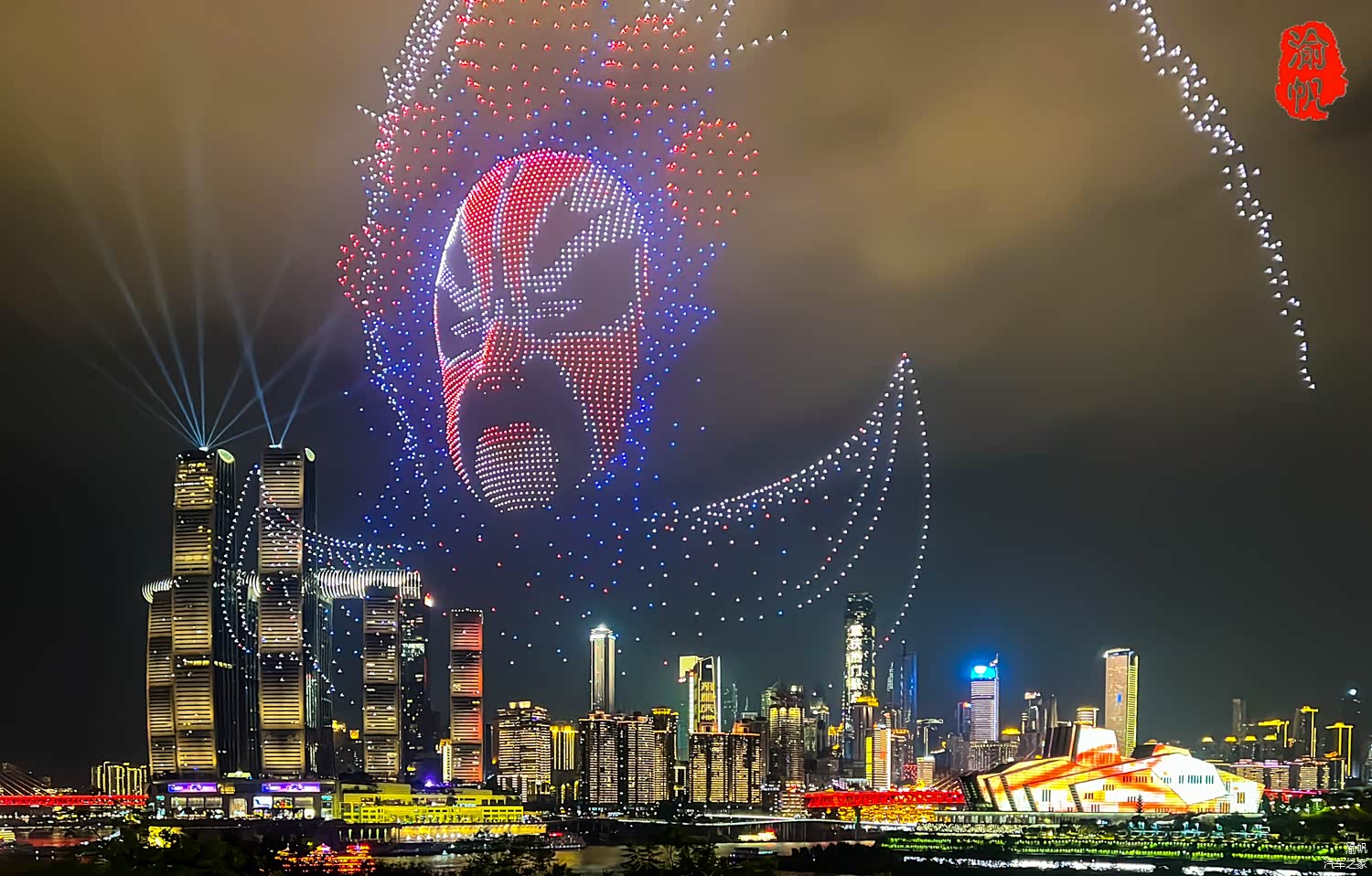 随后是“巴渝绝活”,无人机群幻化的川剧脸谱在夜空中快速变换,让人目不暇接,紧接着,口中烈焰喷薄而出,那炽热的火焰仿佛点燃了整个夜空,也点燃了观众们的热情。现场观众们纷纷惊叹叫好,掌声雷动,大家都被这传承千年的巴渝文化瑰宝所深深折服,感受到了重庆深厚的文化底蕴和独特魅力。