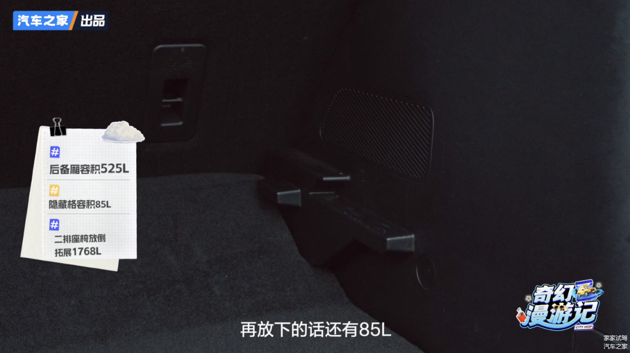 更贴心的是那两档可调节隔板,能额外拓展 85L 隐藏空间,总容积到 610L,折叠伞、充电线和应急工具分类放在隔板上,后备厢始终整整齐齐,一点不杂乱。