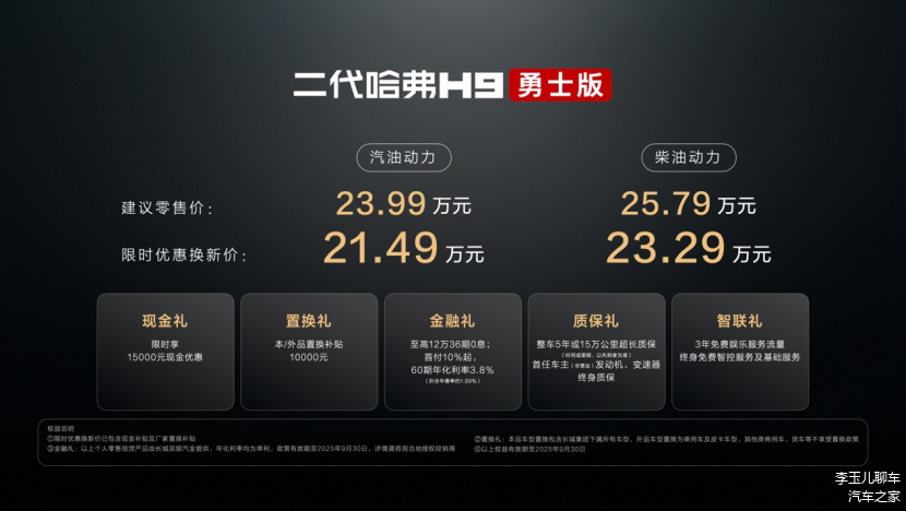 8月26日,二代哈弗H9勇士版正式上市。新车将多项高呼声配置升级为标配,为追求越野激情与品质生活的用户带来“家与远方兼得”的全能驾乘体验。此次发布车型涵盖汽油与柴油两种动力版本,官方指导价分别为23.99万元和25.79万元。即日起下订可享15000元限时优惠及10000元置换补贴,叠加后汽油版入手价低至21.49万元,柴油版低至23.29万元。用户还可享受至高12万36期0息金融方案、五年或15万公里超长质保等多重礼遇。