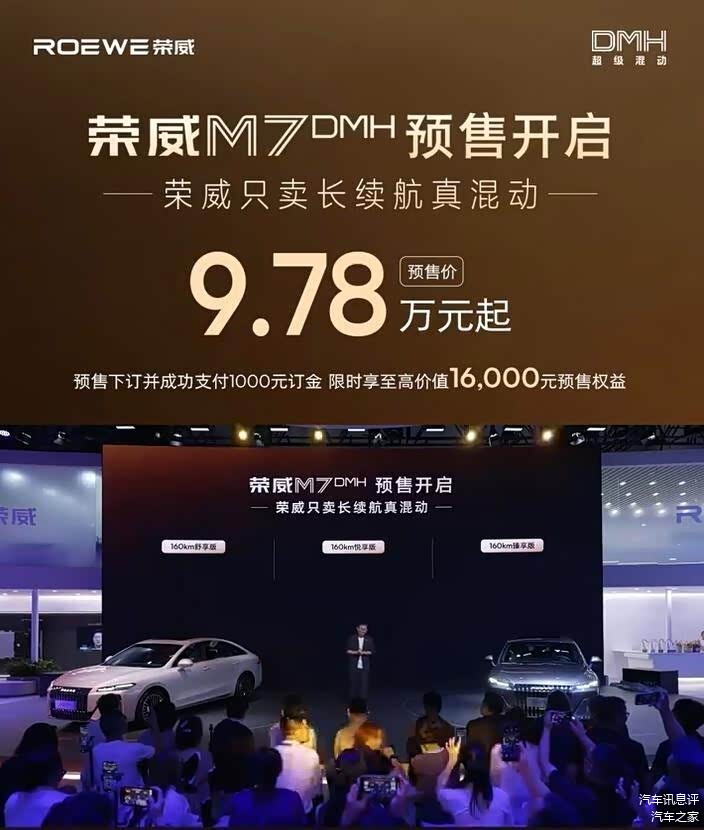 荣威M7 DMH将于9月17日正式上市。目前提供的三款配置版本——160km舒享版、160km悦享版和160km臻享版,预售价分别为9.78万元、10.48万元和11.48万元,使得高性价比纯电出行体验触手可及。
