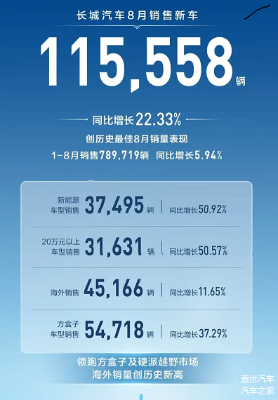 日前,长城汽车公布了最新的月度销量数据,2025年8月,长城汽车销售新车115,558辆,同比增长22.33%,创下历史最佳8月销量表现。今年1-8月,长城汽车累计销售789,719辆,同比增长5.94%,整体表现稳健向上。