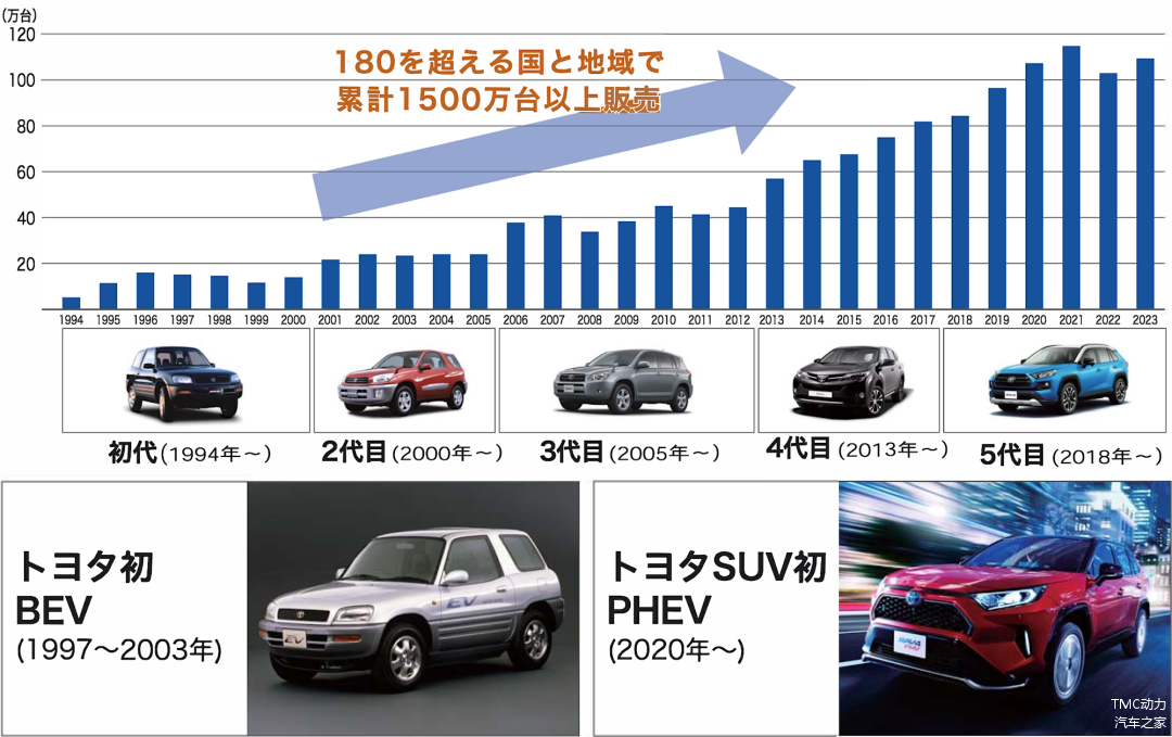 自1994年发布以来,RAV4在全球超过180个国家和地区销售,年销量超过100万辆,全球累计销量超过1500万辆,是丰田连续多年夺得全球销量冠军的主力车型之一。
