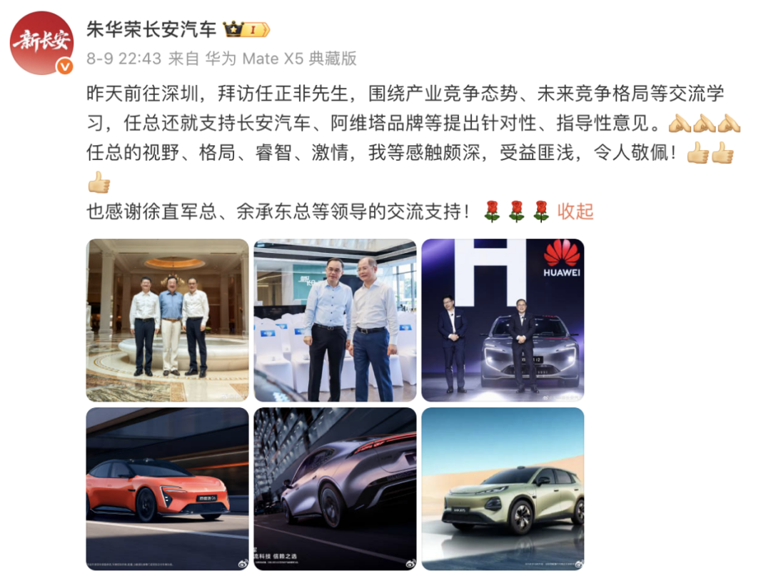 值得玩味的是,8月9日,朱华荣在社交平台发文称赴深圳拜访华为创始人任正非,双方就产业竞争态势与未来格局进行交流,任正非也对长安及阿维塔品牌发展提出建议。尽管未披露具体内容,但也引发市场对长安与华为深化合作的广泛猜测,双方或积极寻求在智能化领域进一步扩大合作。