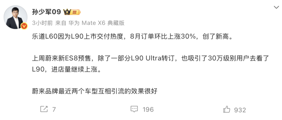 用户信心转化为销量:车主卖车后直接选择乐道L90,本质上是对乐道体系的再投资,这样的闭环为整个品牌的销量提供了支撑。