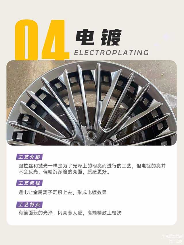 ✅工艺特点:能让轮毂拥有类似镜面的光泽,闪亮夺目,给人高端精致、上档次的感觉。电镀层具有较好的耐腐蚀性和耐磨性,能让轮毂长时间保持美观的外观。