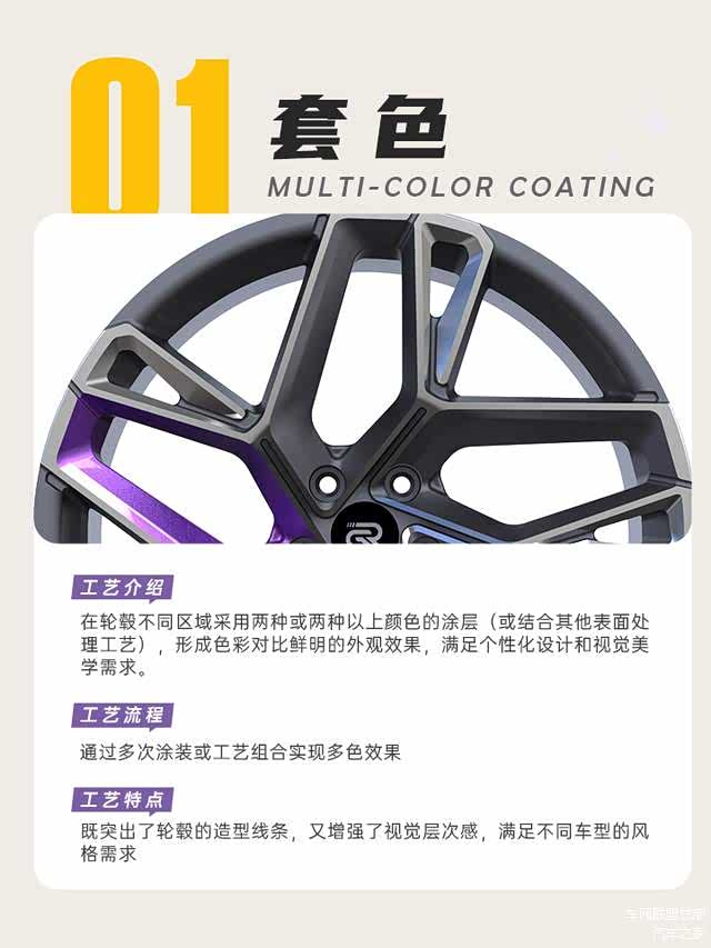 通过在轮毂不同区域采用两种或两种以上颜色的涂层(或结合其他表面处理工艺),形成色彩对比鲜明的外观效果,满足个性化设计和视觉美学需求。