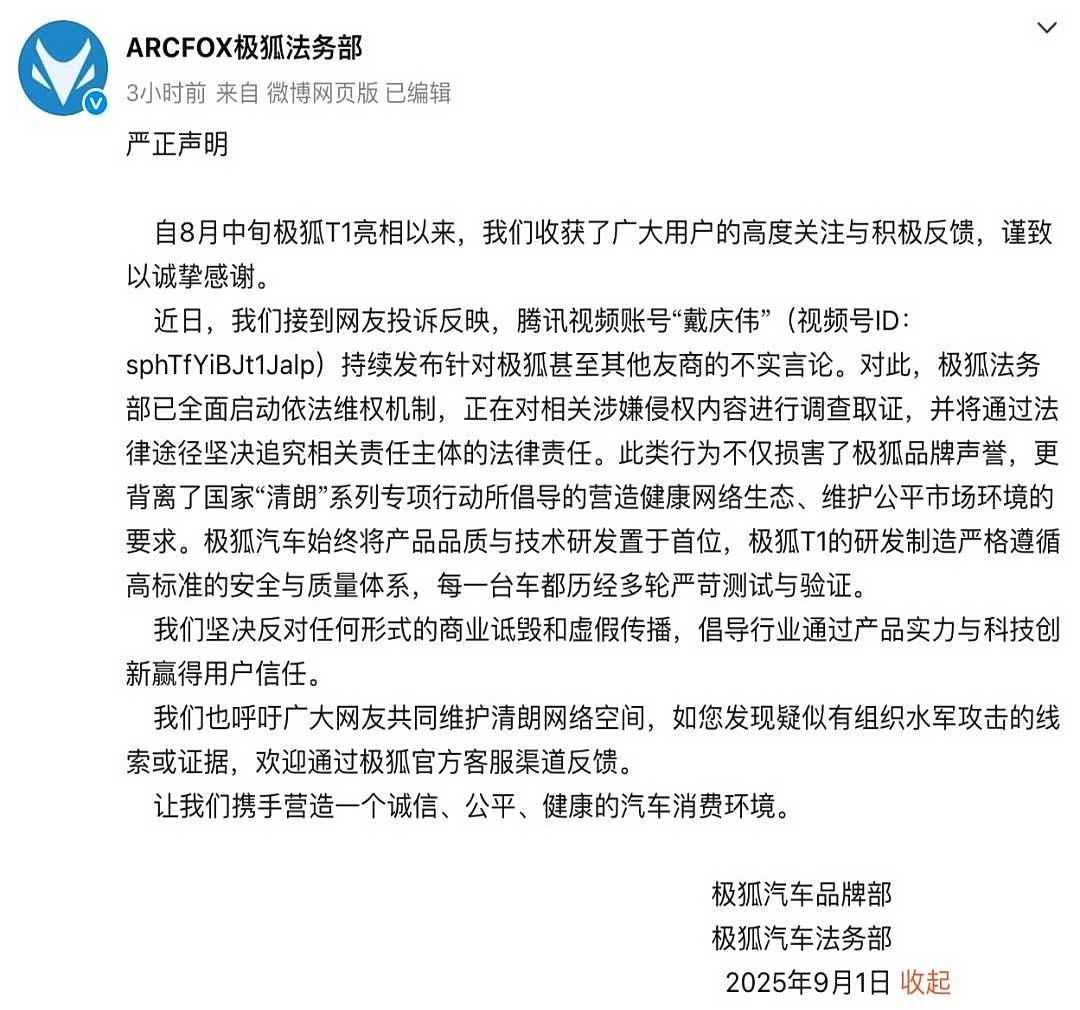 事情是这样的,9月1号,极狐汽车的法务部突然在官方微博上发了一份措辞非常严肃的声明。