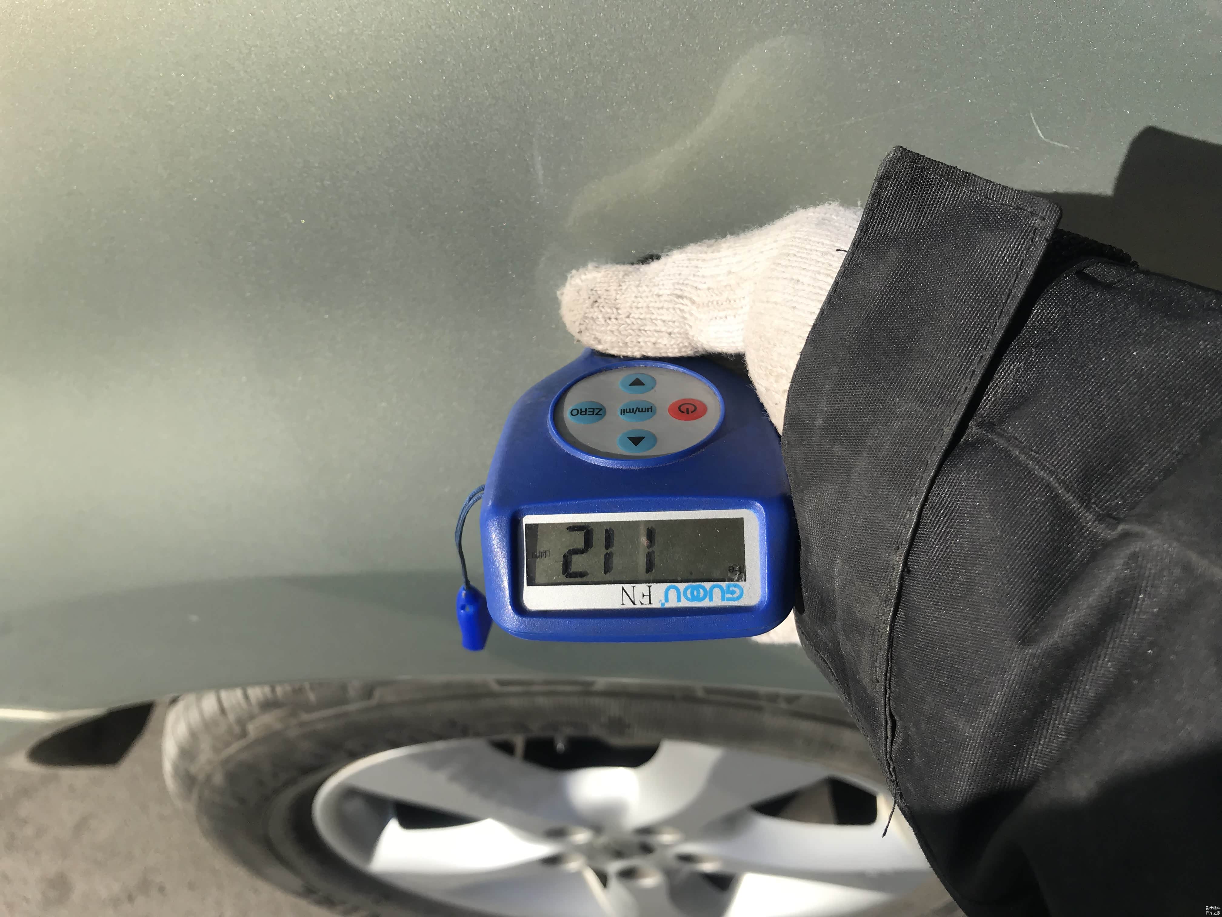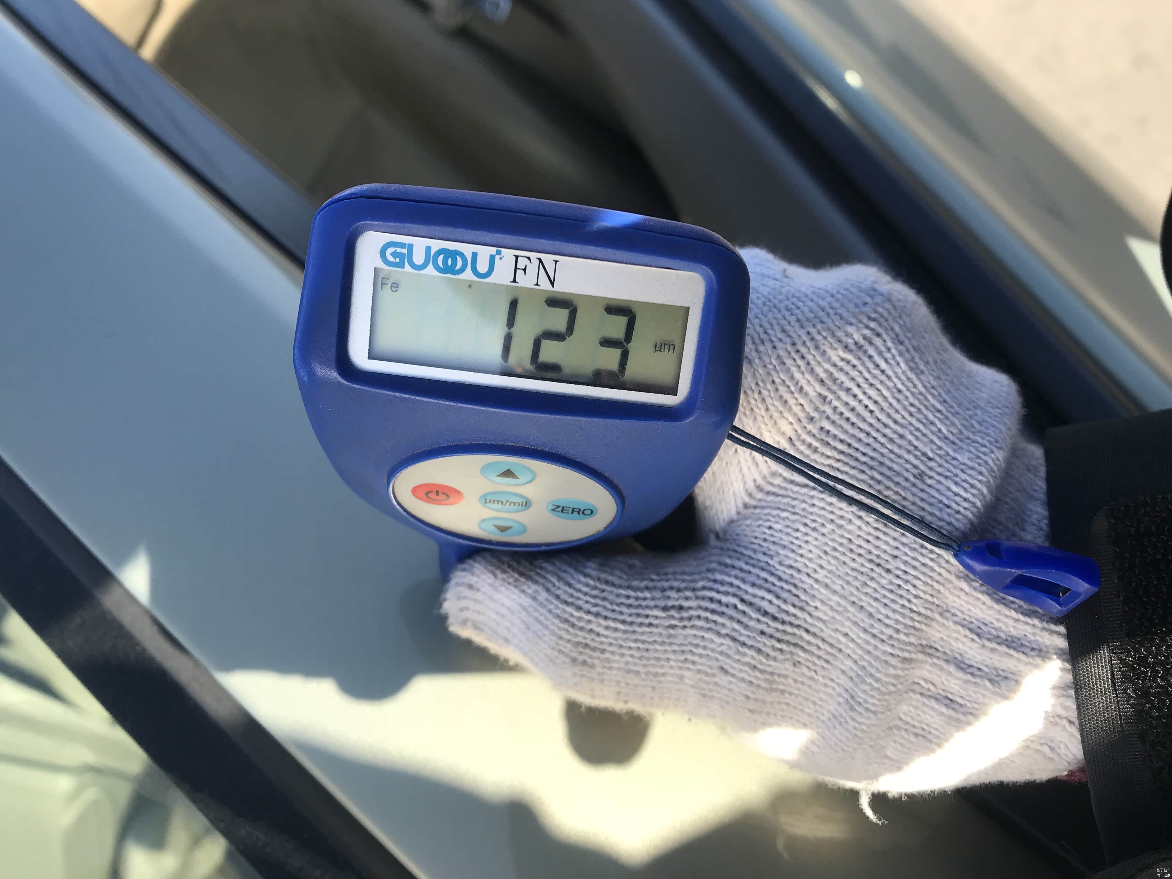 左侧A柱经漆膜仪检测漆面数值为123um。没有发现有补漆的痕迹。