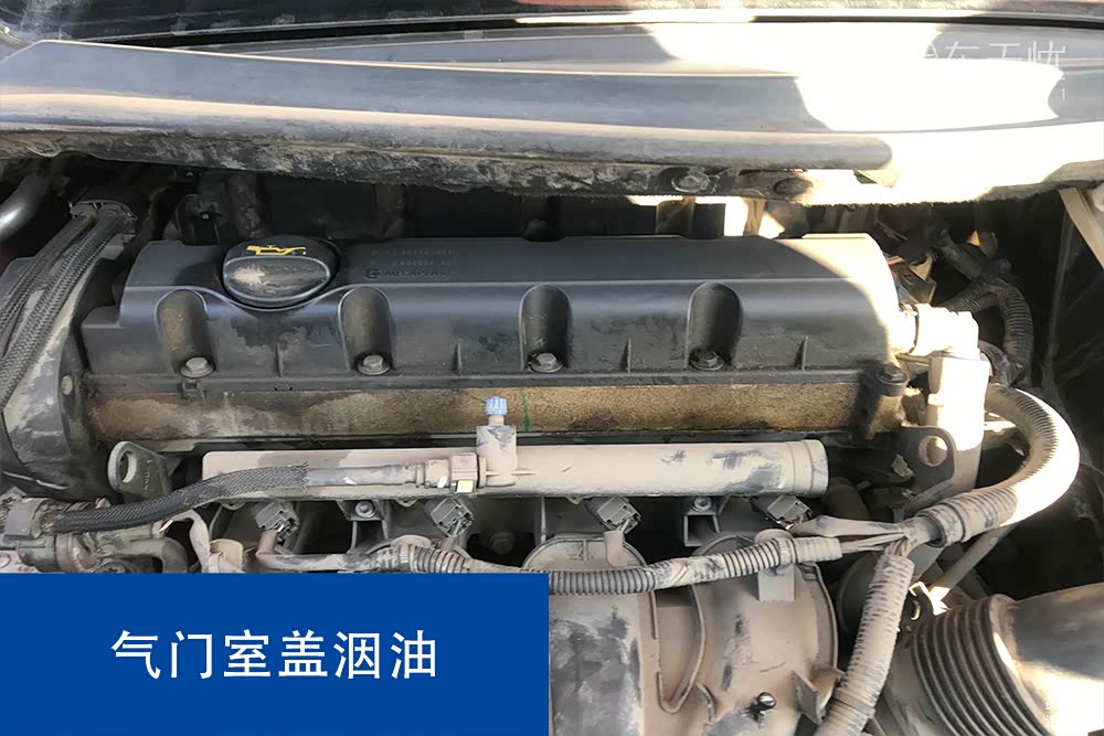 打开发动机舱就看到。气门室盖漏油