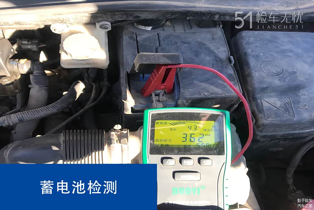 经蓄电池检测仪检测,蓄电池状态为差。建议后期保养时多加留意,以免因蓄电池缺电而无法启动车辆耽误行程