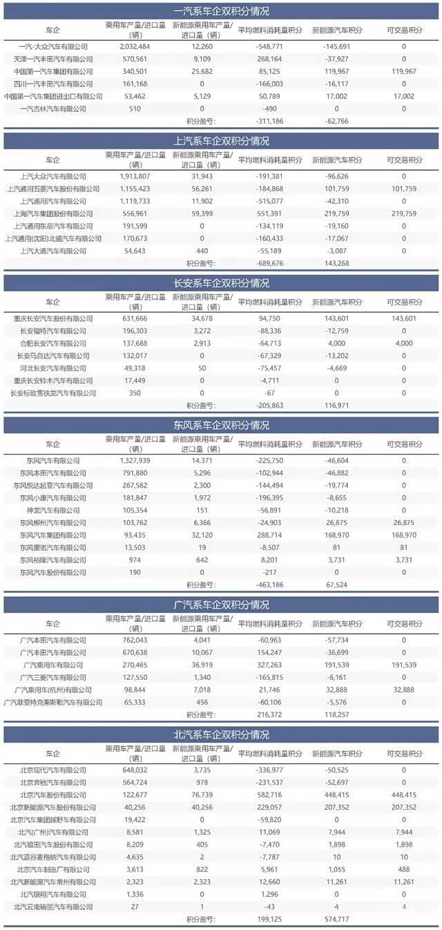 我们不妨按照汽车集团,看看中国六大汽车集团的双积分盈亏情况。