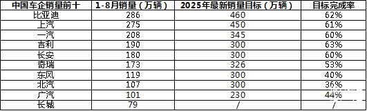 从今年1-8月份销量前十的中国车企数据来看,行业头部阵营格局清晰。比亚迪以286万辆的累计销量稳居榜首,在25年度460万辆最新销量目标中完成率达62%,在新能源赛道持续领跑;吉利汽车表现亮眼,190万辆的销量实现300万辆年度目标的63%,完成率位列前十车企首位;上汽、一汽、长安分别以275万辆、208万辆、180万辆销量,达成各自年度最新销量目标的61%、60%、60%,凭借全品类布局与新能源产品落地,维持规模优势。