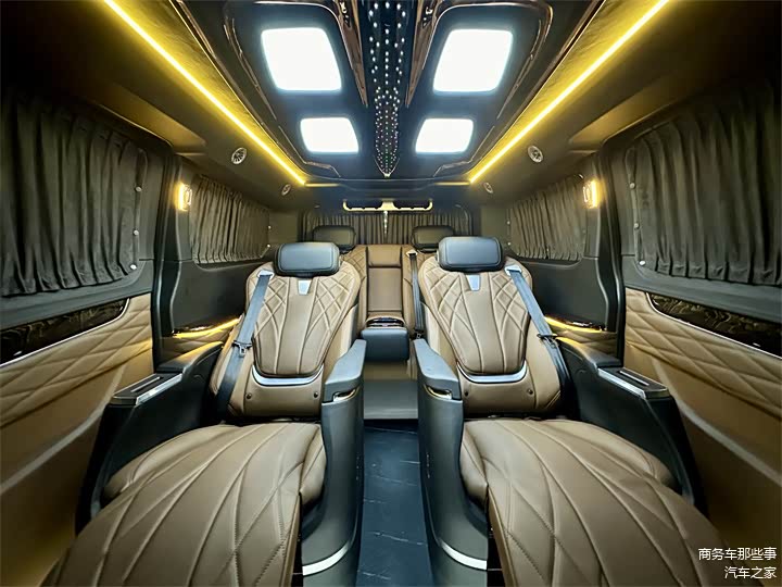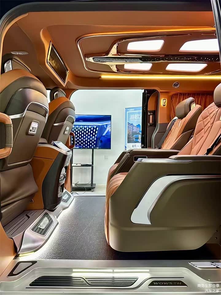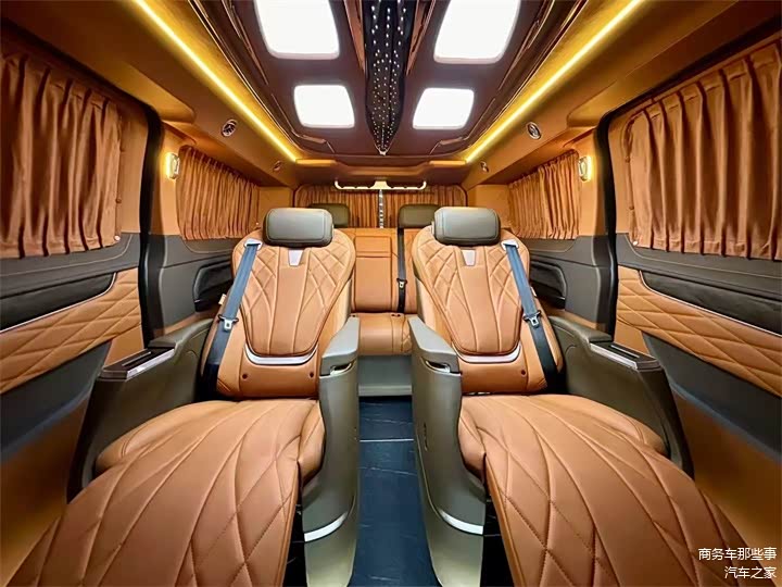 进入到车的内饰里面去,官方配色颜色还是比较多样化的,能够选择像亮丽一点的颜色,稳重一点的颜色,包括清新一点的颜色都可是可以能够给得到的。其中属暮光之城的颜色是最受欢迎的,非常的亮丽具有色彩,从驾驶室开始看,中央扶手冰箱,驾驶室座椅的电动调节,以及通风和加热的舒适功能,通通都有。整车全部都是豪华的软包,覆盖在方方面面,座椅墙板顶部都是的。商务舱带有无线网络电视机,搭载的是vvcar的环绕音响,视听感受都特别的到位,车里面也能够进行休闲娱乐模式,看电影听听音乐都能够满足。中排是豪华的航空大座椅,通风加热按摩旋转腿托的功能通通都有,全部都是多项的一个电子调节简单又便捷。第3排是联排的沙发床可以180度的进行放平平躺,这里面可以正常的进行休息睡觉,在行驶的过程中,沙发床也是可以180度的放平。