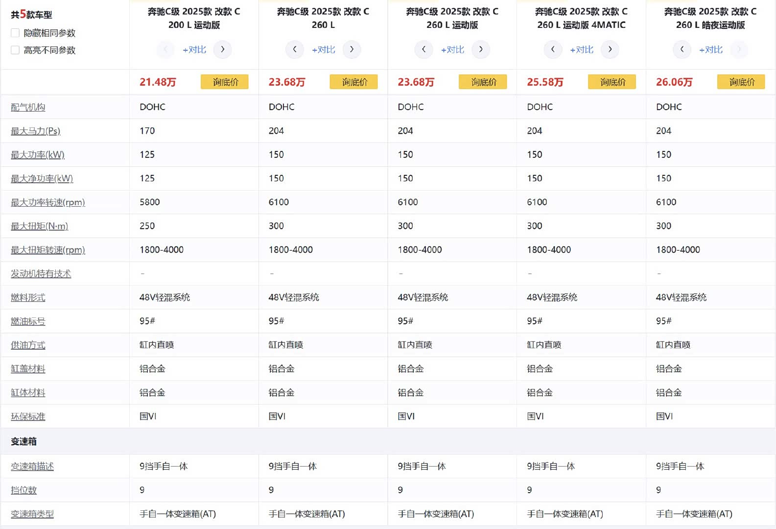 奔驰C200L搭载的1.5T发动机最大功率125kW,最大扭矩250N·m,适配9挡手自一体变速箱,官方零百加速9.2秒,奔驰C260L搭载的1.5T发动机最大功率150kW,最大扭矩300N·m,适配9挡手自一体变速箱,两驱版零百加速7.8秒,四驱版零百加速7.6秒,要知道奔驰C260L指导价可是35万+起售了,虽然现在优惠挺多,但动力还是稍微弱了一点。