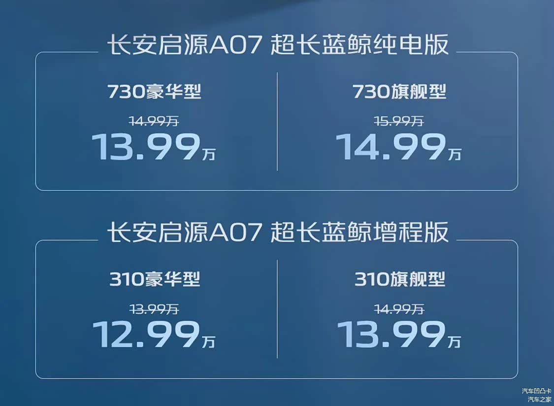 9月10日, 长安启源A07(图片 | 参数 | 询价)超长蓝鲸纯电版/增程版正式上市,其中超长蓝鲸纯电版的续航里程达到730km/超长蓝鲸增程版纯电续航达到310km,均支持3C快充技术和6kW对外放电。新车共发布4款车型(纯电/增程各2个配置版型),官方指导价为13.99万元-15.99万元,叠加补贴后的权益价为12.99万元-14.99万元。