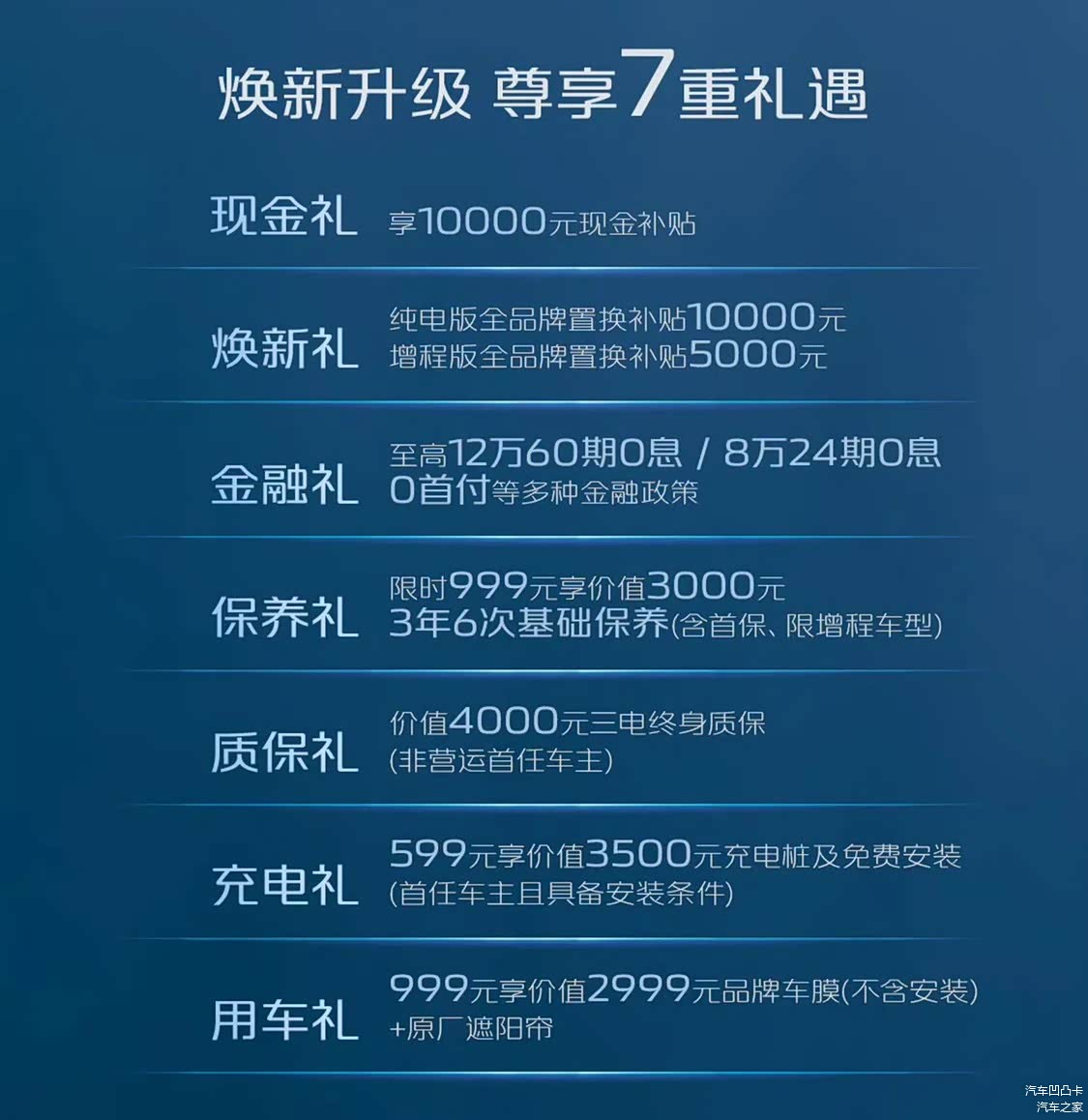 随新车上市,长安启源还公布了A07超长蓝鲸纯电版/增程版的7项购车权益,包括1万元现金补贴、纯电1万元/增程5000元置换补贴、至高12万60期0息或8万24期0息等多种金融政策、999元享价值3000元3年6万公里基础保养、非运营车主享价值4000元三电终身质保等丰富的购车权益。