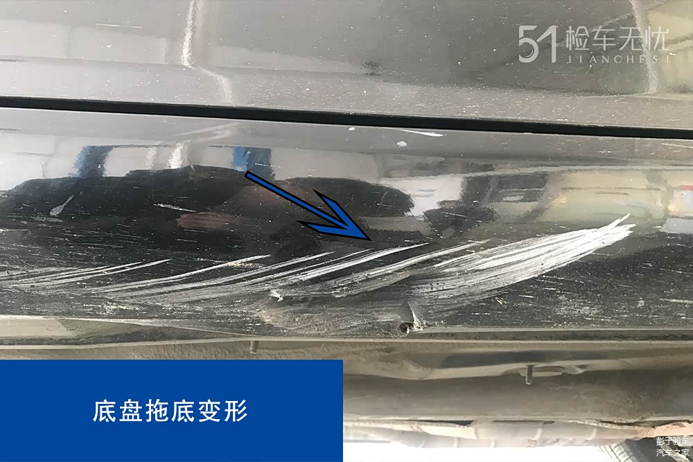 发现右侧底大边托底变形,建议:在路面较差时,减速慢行确定好行驶路线,避免托底损坏底盘部件。