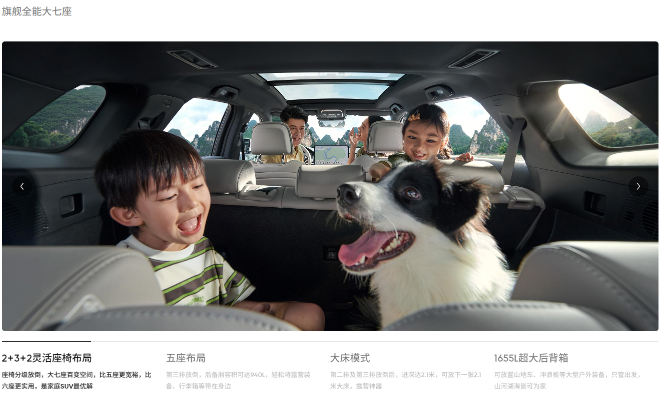 空间利用展现旗舰水准:2+3+2 七座布局下,第三排膝部空间达 650mm,比理想 L7 多出 30mm;后备箱标准容积 230L,放倒第三排后扩展至 520L,全部放倒后可达 1650L,可容纳婴儿车、露营装备等大件物品。前排中央扶手箱采用 “上下双层 + 侧面抽屉” 设计,下层可放置 10.2 英寸平板,抽屉适合收纳证件等小物件,细节处体现家庭用车考量。