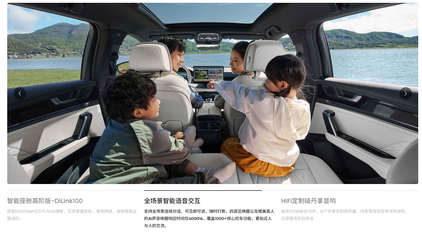 内饰延续 “环抱式” 设计理念,中控台采用搪塑软质材料 + 金属饰条 + 钢琴烤漆三重材质组合,触感与视觉质感达到 30 万级水准。智能交互系统分为两级:基础版配备 12.3 英寸液晶仪表 + 15.6 英寸可旋转 Pad,搭载 DiLink 100 智能车机系统,支持 4G 网络和 OTA 升级;激光雷达旗舰型升级为 W-HUD 抬头显示。
