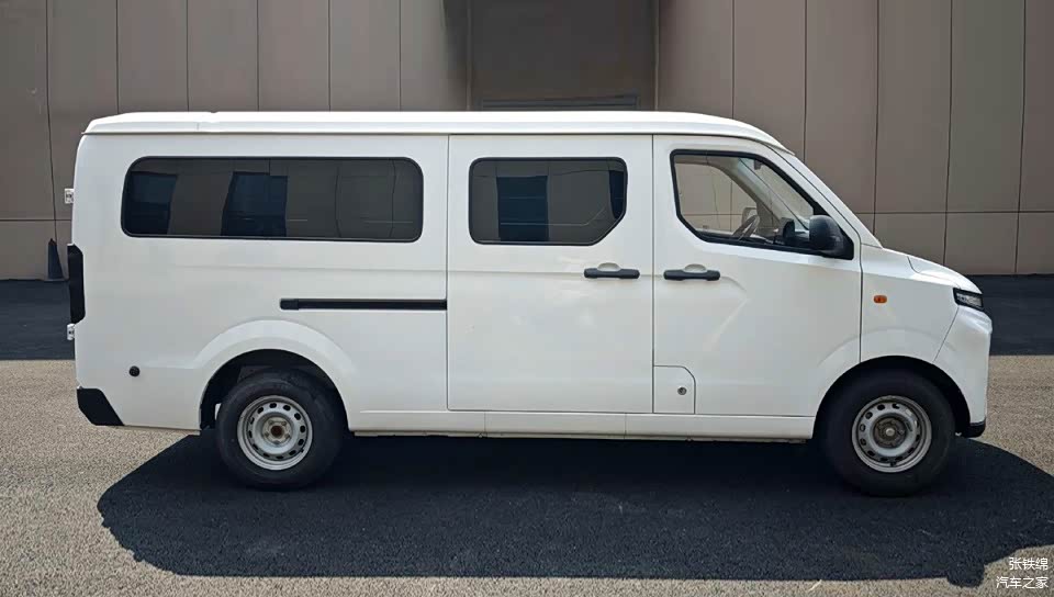 车身侧面造型简洁硬朗,车顶线条平直,使用了右侧单侧后排侧滑门设计,宽厚的车门窗框使用了与车身同色的涂装。尺寸方面,新车的长宽高分别为4845/1730/1985mm,轴距为 3100mm。