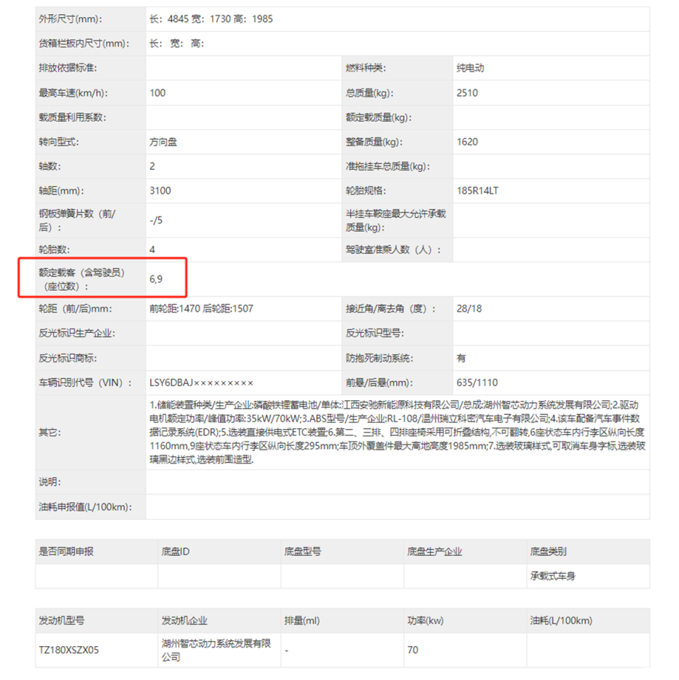 动力配置部分,新车搭载的是最大功率为70千瓦的电机,匹配的是江西安驰新能源的磷酸铁锂电池,其申报的最高车速为100km/h。