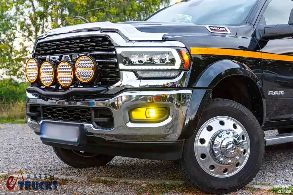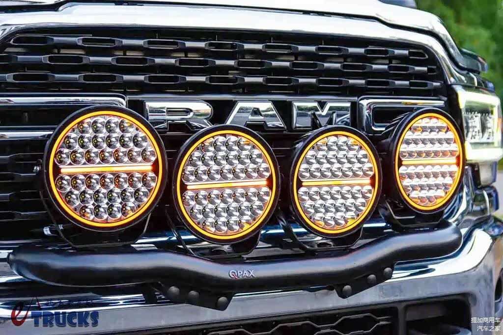 既然到了欧洲,那就得“入乡随俗”。为了使车辆前脸更饱满、更张扬,这台RAM 5500在前面罩外侧加装了灯杠,并在上方设置四台探照灯。它们的存在能够照亮前方道路,不过日常使用都只开着黄色的日间行车灯光,主打一个装饰作用。