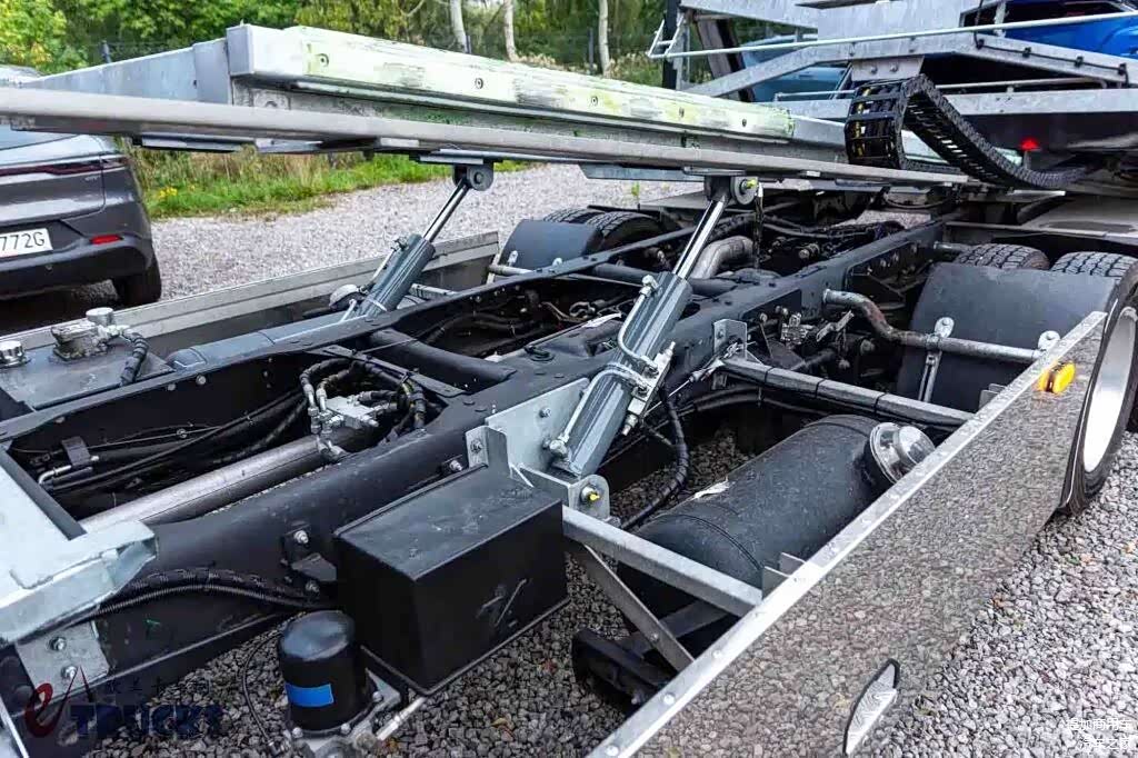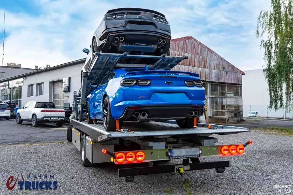 上装部分采用半落地式结构,展开时自身形成坡道。先装载上层车辆,之后顶升上层平台,并装载下层车辆。卸载过程就是装载过程反过来,先卸下层车,再放下上层平台、卸下上层车辆,全程无需其他机械介入,可借助车辆自身动力。4吨左右的载荷,拉两台小车是绝对没问题的。