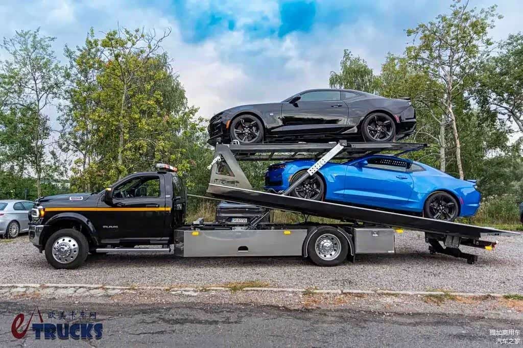 车辆上装部分由波兰本土企业:Magoot公司制造。这款上装采用半落地式一拖二设计,可同时运输两台乘用车,法定有效载荷为3996KG。在满载的情况下,这台RAM 5500皮卡的总重来到了9.68吨,这无疑是一个恐怖的参数。