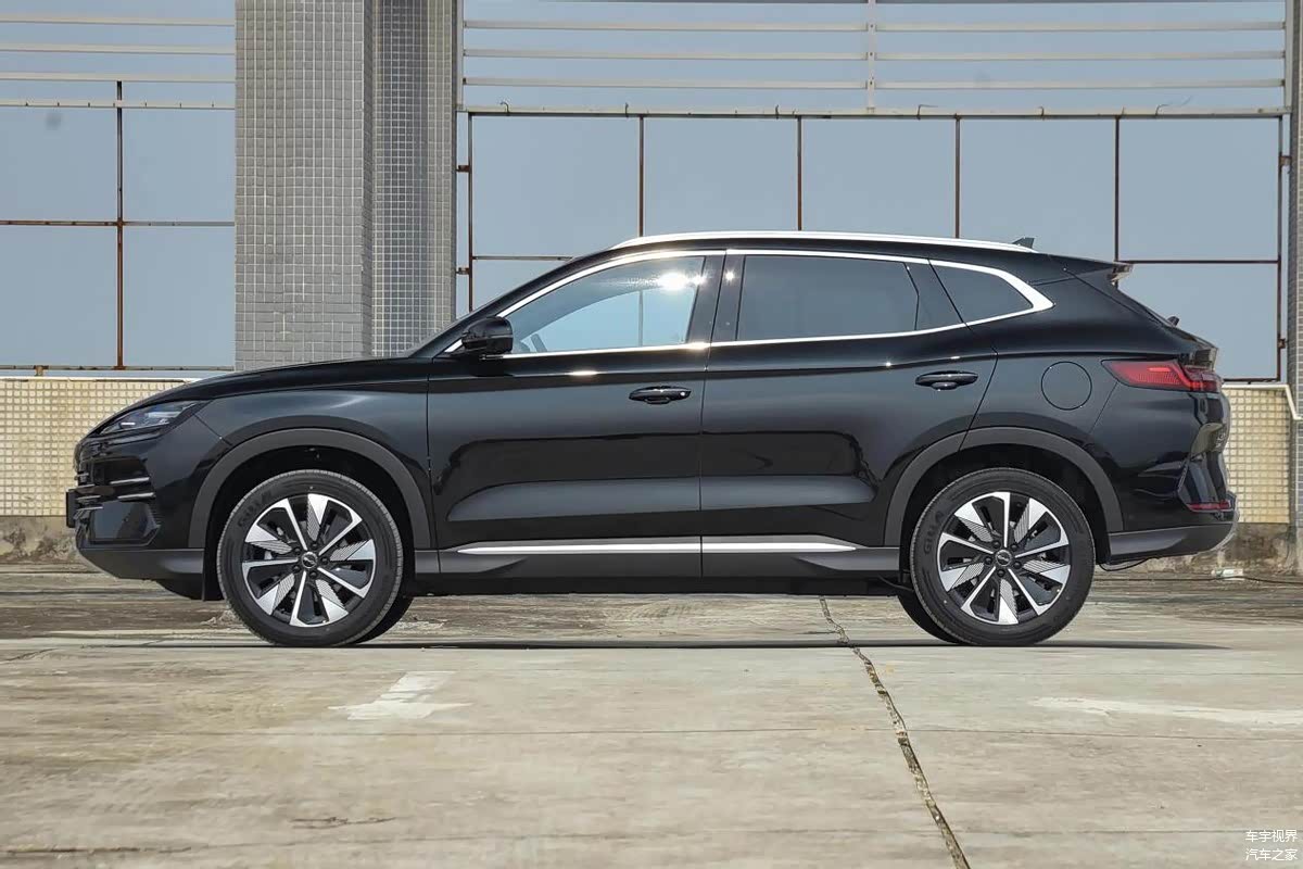 然后车身部分,宋PLUS DM-i采用了传统的三厢车结构,没啥让人惊艳的感觉,门把手也是外露式设计,车窗采用了镀铬饰条包边来增加质感,同时下方的双色五辐轮圈增加了一定的运动气息。
