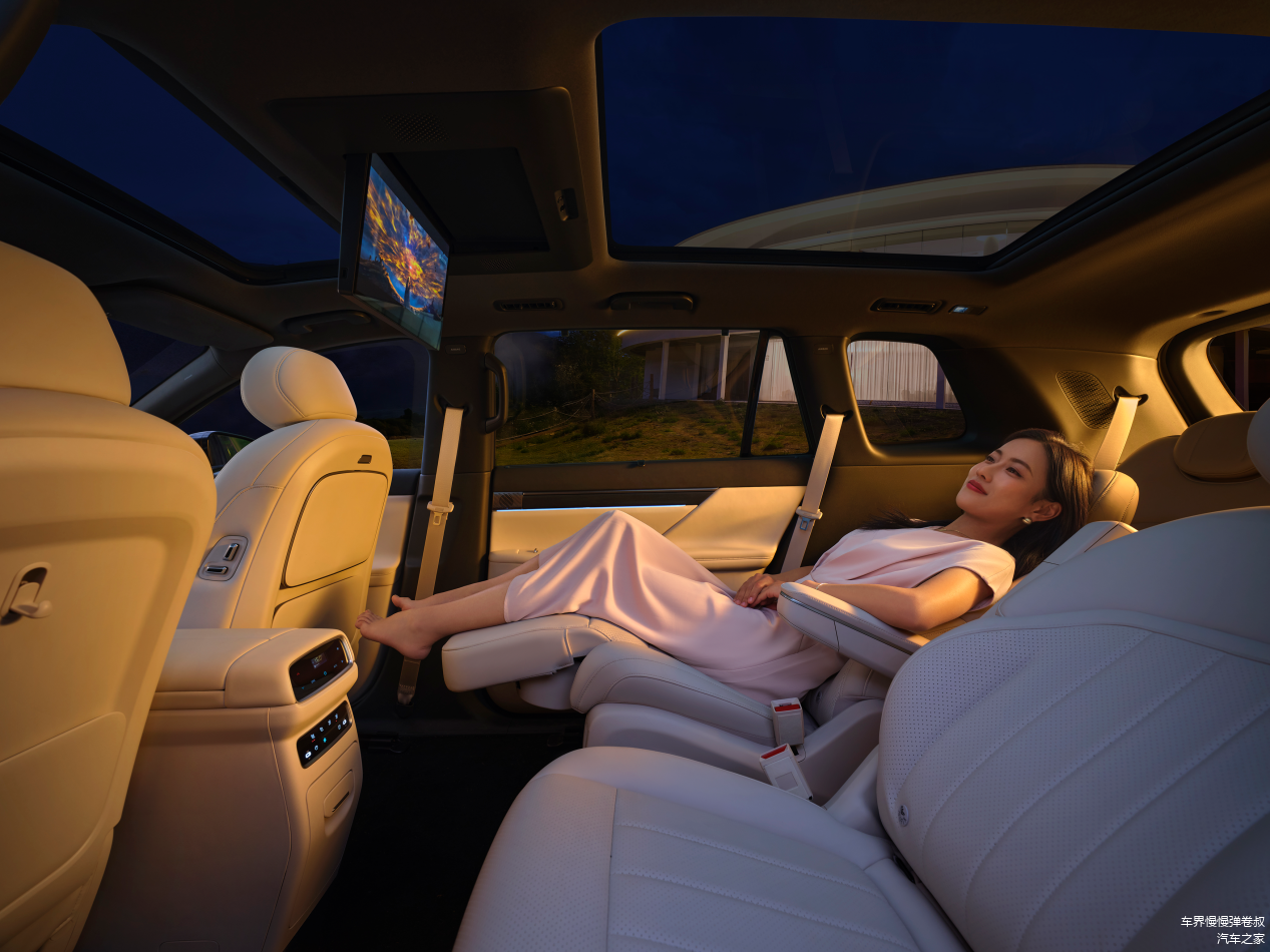 第二排放置双侧独立滑动航空座椅,支持电动调节前后与横向距离,中央通道最宽达 190mm,保障第三排进出自由。二排靠背最大可放倒 140°,配合可选装腿托实现近乎平躺状态,再加上车载冰箱、吸顶屏幕等,也算是“冰箱、彩电、大沙发”一应俱全。