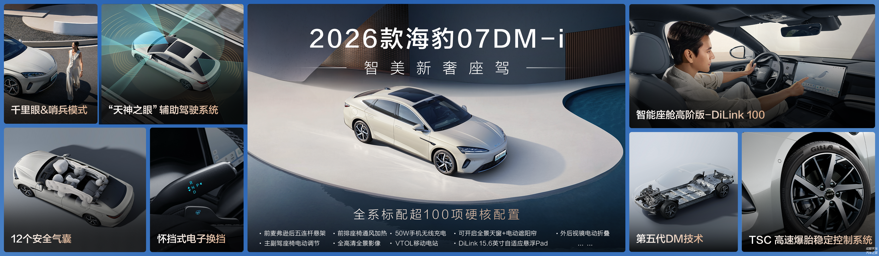 2026款海豹07DM-i拥有新能源车专属的高强度安全车身,全系标配12个安全气囊,同时配备驾驶员疲劳监测、AEB自动紧急制动、内后视镜自动防眩目、哨兵模式、千里眼等超30项主被动安全配置,为出行保驾护航。此外,全系标配TSC高速爆胎稳定控制系统,可实现140km/h爆胎脱手控制,在极危险的高速爆胎环境中依旧保持车身稳定,为用户提供更全面的安全守护。