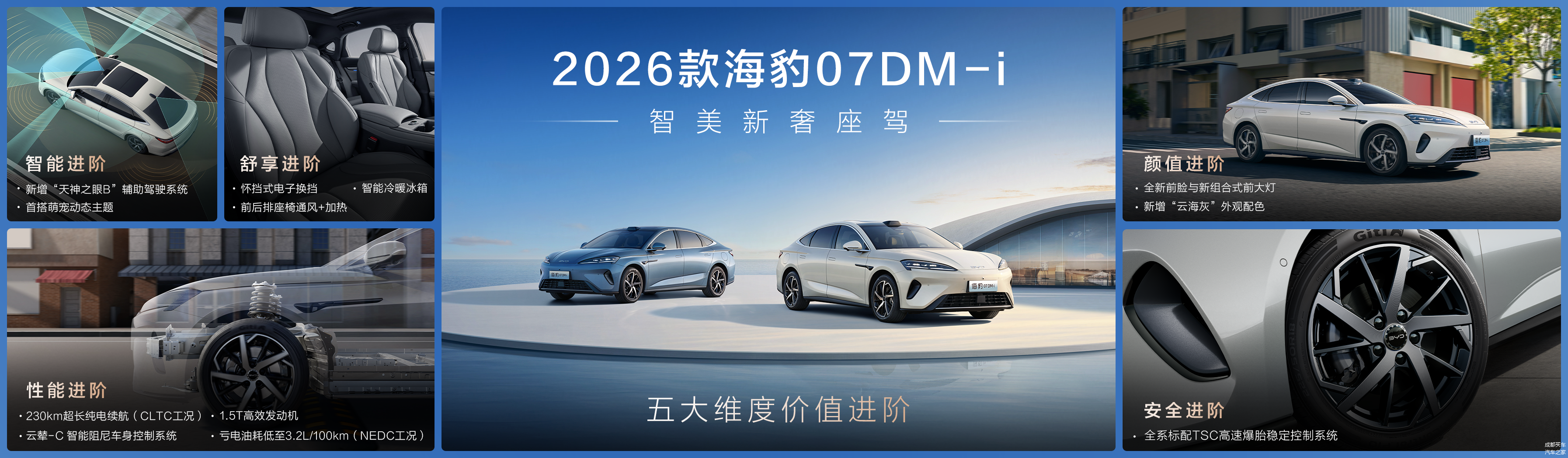 9月15日,智美新奢座驾——2026款海豹07DM-i正式上市,新车共推出4个配置版本,官方指导价格为14.98万元-18.68万元,并推出越享钜惠礼、越享置换礼等六重购车礼遇。2026款海豹07DM-i在“智能、舒适、性能、颜值、安全”五大维度全面进阶,基于全新一代插混整车平台打造,新增云辇-C 智能阻尼车身控制系统、TSC高速爆胎稳定控制系统及天神之眼 B - 辅助驾驶激光版(DiPilot 300)等硬核黑科技,为用户带来高品质出行新体验。