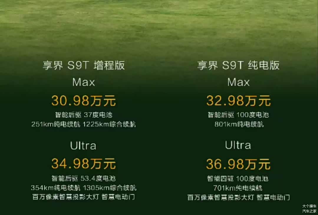纯电Max版本的售价为32.98万 801km,并配备了续航和后驱功能,其标准配置包括ADS 4和空气悬挂系统,特别适合那些需要方便充电和追求长时间续航的用户。36.98万版本的顶级配置增加了四驱系统和自动开闭门,这6万的价格差异主要是为了提高加速性能。对于那些对动力性能不特别挑剔的人来说,这款车并不推荐购买