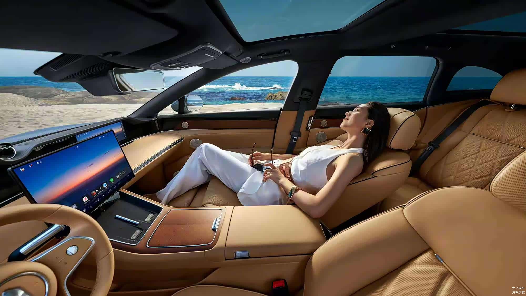 当你坐进车里,首先映入眼帘的是一个12.3英寸的仪表盘、16.1英寸的中控显示屏、12.3英寸的副驾驶娱乐屏幕,而后座则配备了32英寸的投影屏幕和磁性吸控屏,这样的配置确保了你的驾驶体验不会显得单调。在舒适度方面,副驾驶座位采用了零重力设计,支持125度的调节,并配备了通风、加热和按摩功能,使得长途驾驶时可以稍作放松;后排的真皮座椅不仅提供按摩功能,还配备了6.2L的冷暖箱、三温区空调和电动遮阳帘,确保了对乘客的细致关照。尽管内部装饰的材料在触感上并不便宜,但与相同价位的豪华品牌相比,在触感上仍存在一定的差异。