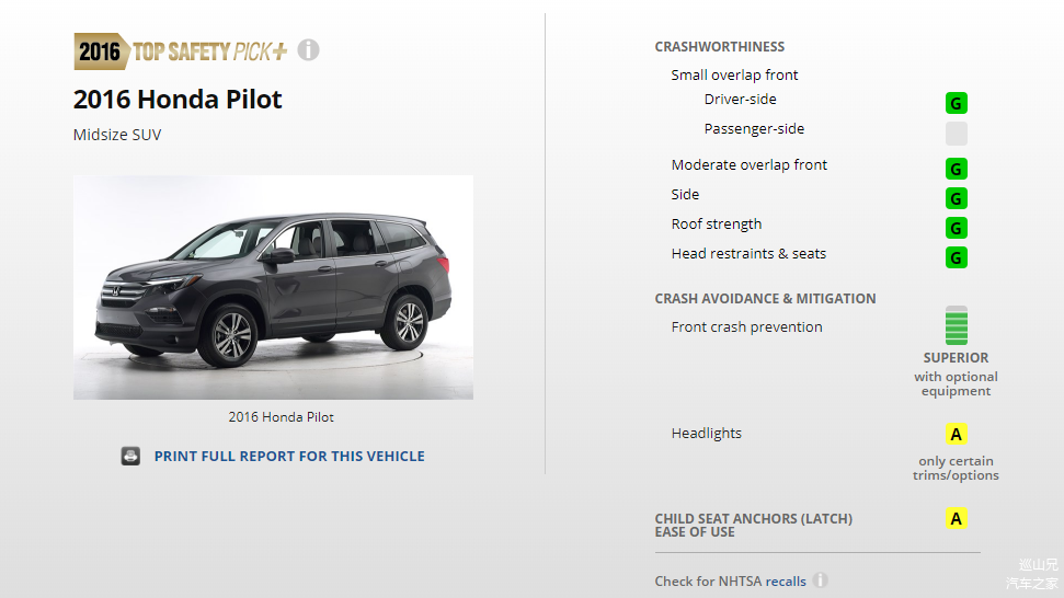 由图可见,除副驾驶小截面测试未做以外,Pilot在所有的碰撞测试项目上均取得了优秀的成绩,防碰撞预警系统评级为优秀,也就意味着在19km/h和40km/h的两种速度下都有效避免了碰撞。大灯测试成绩良好,儿童安全座椅接口易用性成绩为良好。