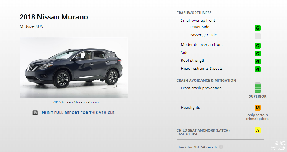 IIHS的成绩分为四个等级,分别为优秀(Good),良好(Acceptable),合格(Marginal),较差(Poor);作为普通消费者,我们可以通过其简报一目了然地分辨出车辆的碰撞测试成绩。
