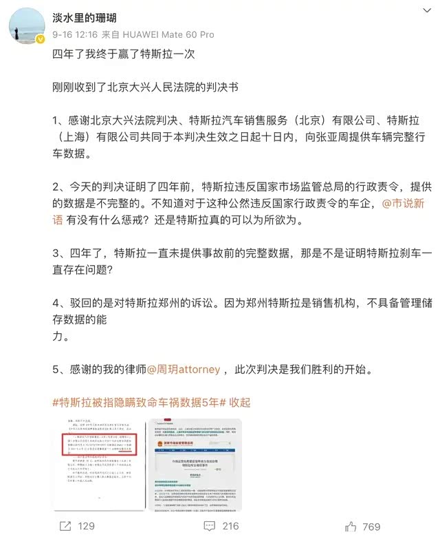 扰攘了整整四年,河南特斯拉“车顶维权”一案当事女车主张女士,终于赢来了她的第一个“胜诉”。