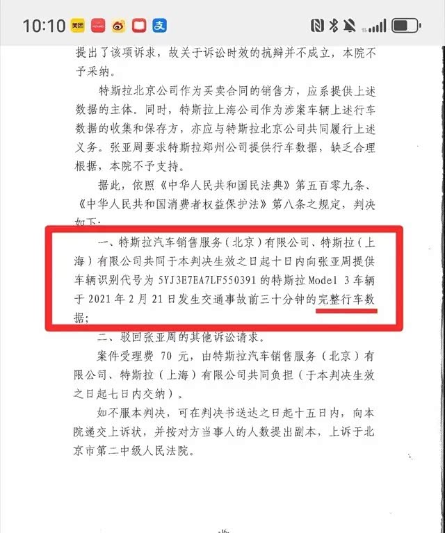 9月16日,北京市大兴区人民法院就张亚周诉特斯拉汽车销售服务(北京)有限公司等买卖合同纠纷一案作出判决。车主提供的判决书显示,法院判令特斯拉于判决生效之日起十日内,向车主张女士提供于2021年2月21日发生交通事故前三十分钟的完整行车数据。