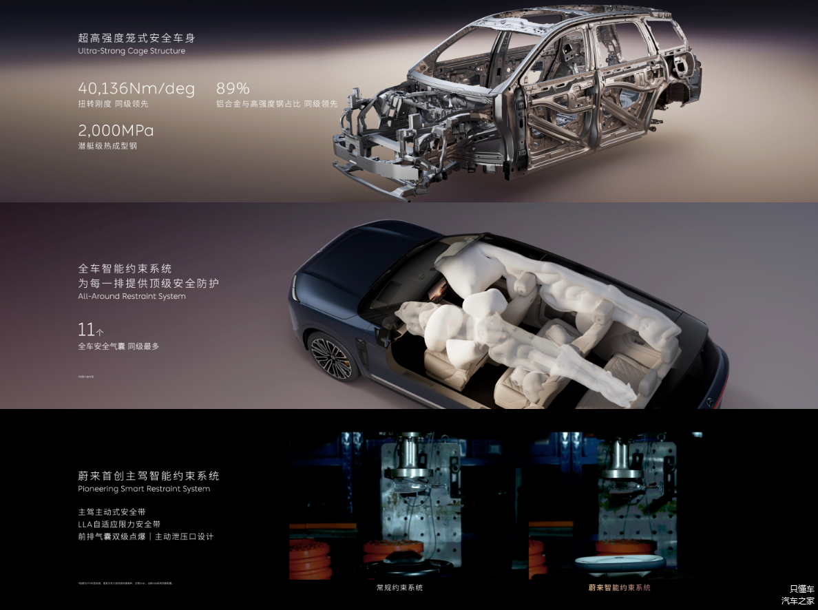 全新 蔚来ES8(图片 | 参数 | 询价)正式上市,新车是老款车型的全新换代车型,基于蔚来最新的NT3.0平台打造,车身尺寸进行了全面提升,并提供6/7座两种座椅布局形式可选,动力方面搭载双电机四驱系统,综合功率520千瓦,百公里加速3.97秒,全系配备102千瓦时电池组,CLTC纯电续航635km,支持5C超充和换电,底盘配备自研的神行智享底盘,标配双腔空气悬架+CDC。