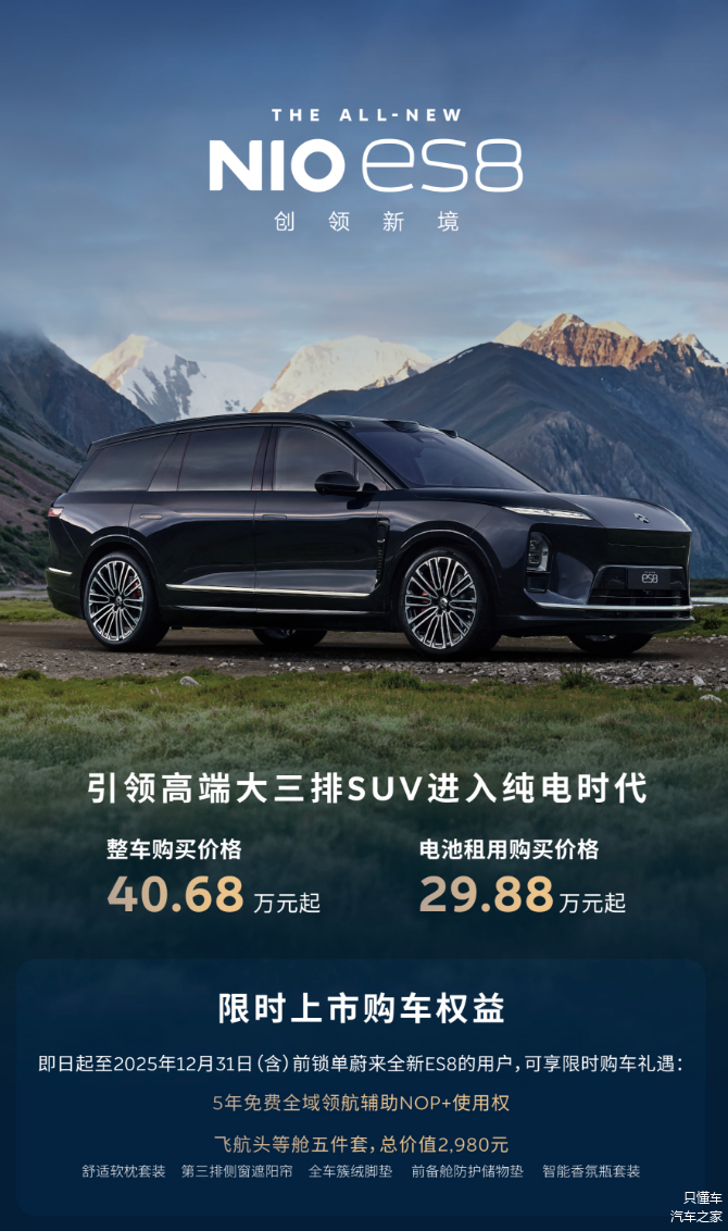 新车共推出3款车型,整车购买价格为40.68-44.68万元,电池租用方式购买价格为29.88-33.88万元。作为对比,此前该车预售推出3款车型,整车预售价为41.68-45.68万元,电池租用预售价为30.88-34.88万元。而老款蔚来ES8售价为49.8-57.8万元。